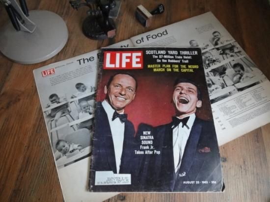アメリカヴィンテージの大衆雑誌「LIFE」です。アメリカの歌手フランク・シナトラと息子のフランクJr.が表紙を飾っています。ディスプレイはもちろん、本紙中身もカラフルでポップな企業広告や写真が満載でページをめくっているだけでとても楽しめます。