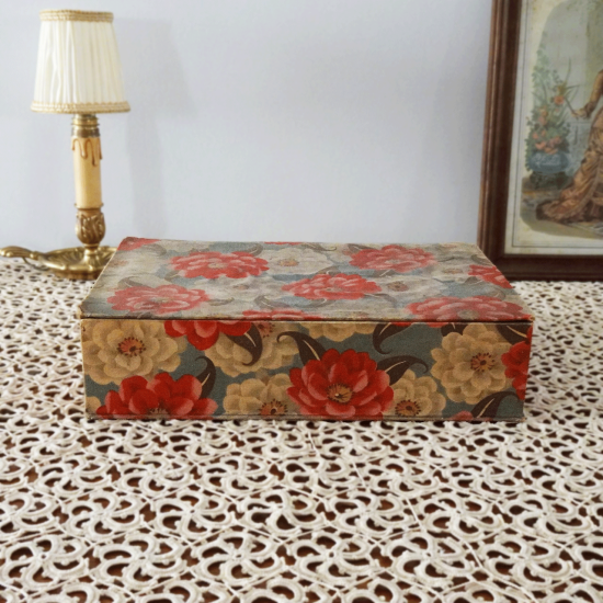赤と白の大きなダリアの花の布地が貼られた美しい布箱。