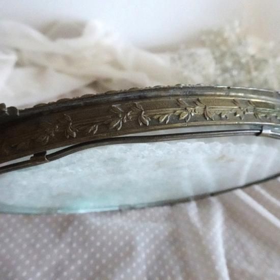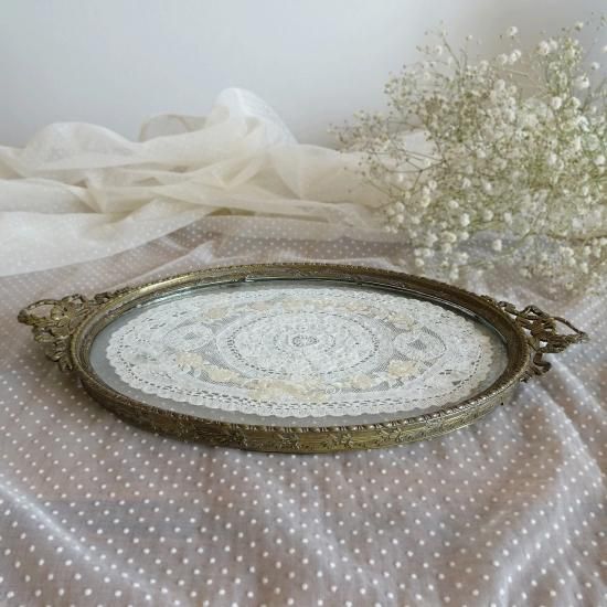 フランスアンティーク 月桂樹とリボンフレーム ドレッシングトレイ レースのドイリー付き(真鍮とガラス)