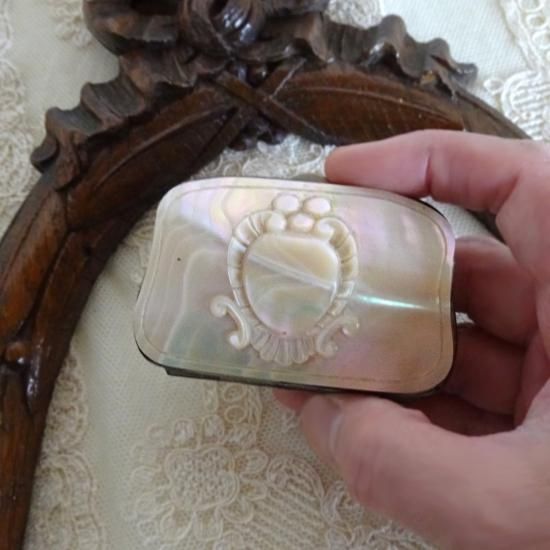ロカイユのモチーフが彫刻されたマザーオブパールのコインパースです。