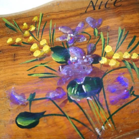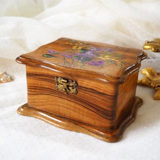 すみれとミモザがペイントされたモシュリンヌボックスです。