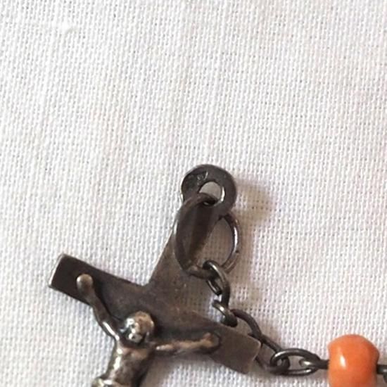 本珊瑚のビーズと純銀のクロス、メダイが使われたロザリオです。