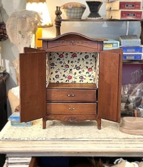 フランスアンティーク 木製ドール家具 アルモワール ワードローブ 洋服箪笥 ミニチュア家具 お花模様の布張りと引き出し付き